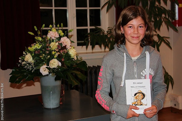 Het gevorderde uur maakte dat van de negen jonge deelnemertjes er slechts één aanwezig was: de 11-jarige Ella Coenegrachts, die hier met haar prijs staat te glunderen.